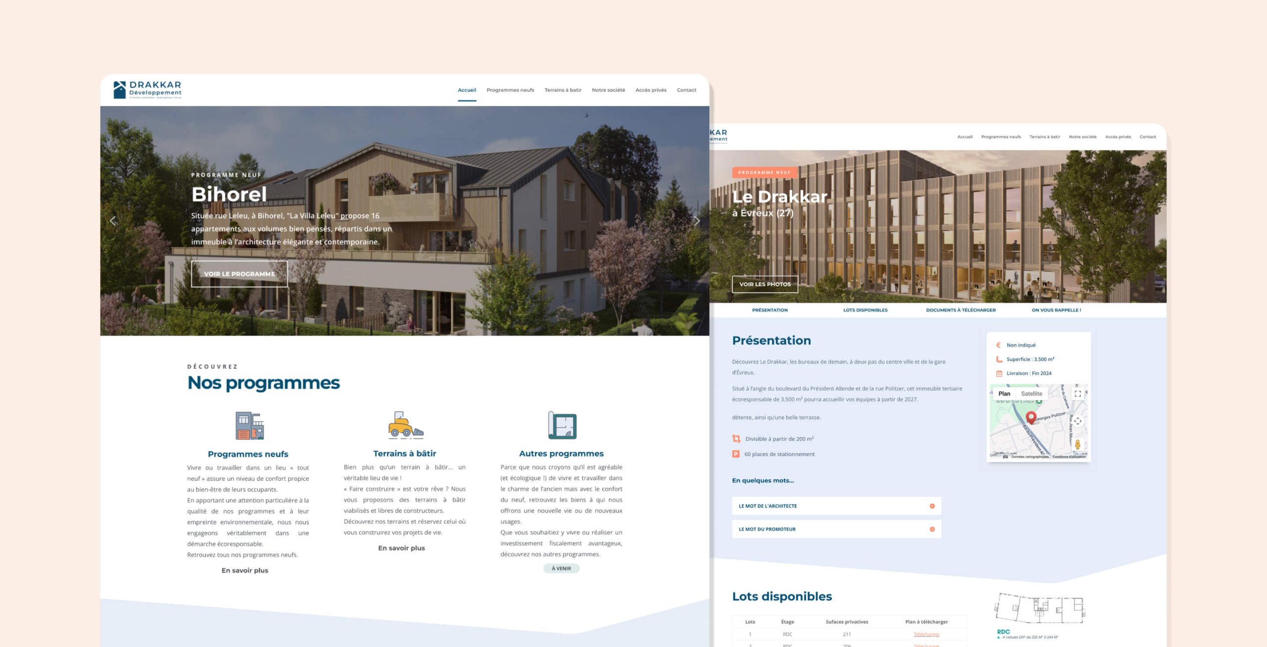 Lorsque j’ai accompagné Drakkar Développement, le besoin était de structurer une présence digitale forte et autonome pour valoriser les projets immobiliers et simplifier la diffusion des documents auprès des prospects.